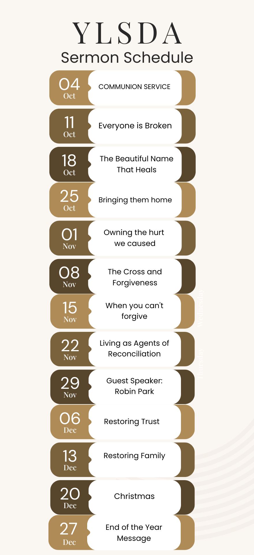 Throughout this series, we will explore what it means to face our brokenness, acknowledge hurts we may have caused, and walk toward forgiveness, trust, and healing in Christ. Whether you are new to church, returning after some time away, or looking for a place to belong, we invite you to join us as we discover together how Grace makes reconciliation possible.